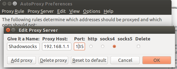 Ubuntu浏览器代理上网设置,以FireFox配合AutoProxy为例,增加Proxy Server, Proxy Host填192.168.1.1,Port是7654, 勾选Sock5.如下图: